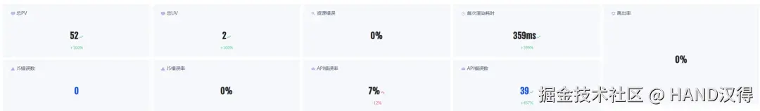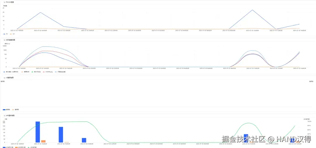 一眼掌握健康状态:展示所选应用在指定时间段内的核心指标,PV、UV、首屏渲染耗时、JS 错误数、API 请求量等,全局掌握系统运行态势。