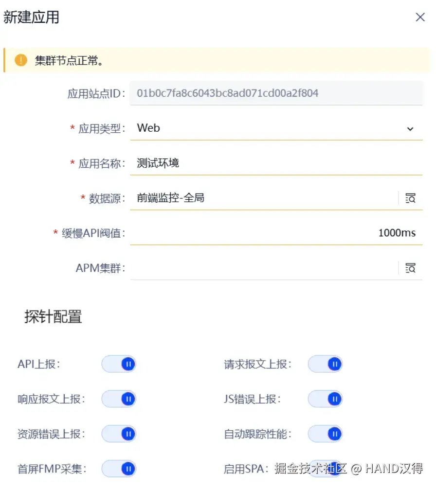 前端监控/应用列表:新建前端监控应用,并按需配置探针相关属性。关键属性如下: