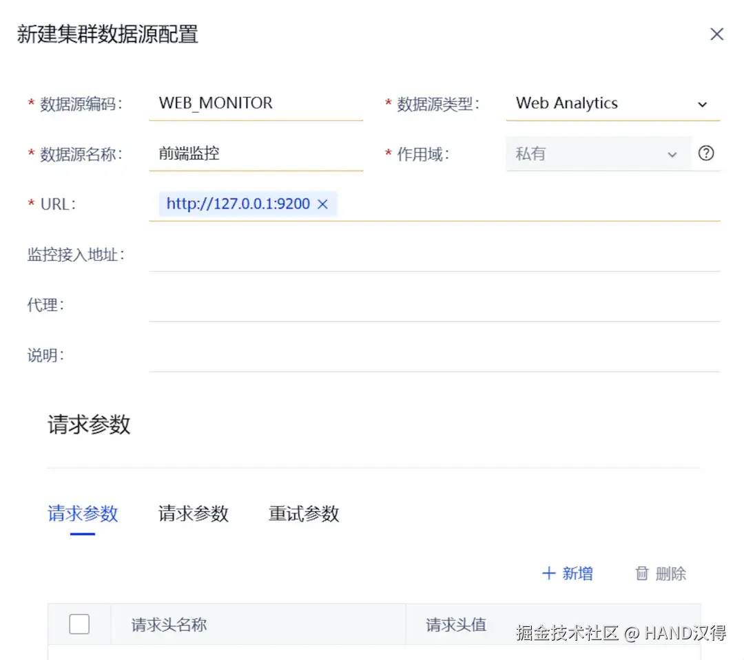 服务可观测性/集群数据源配置:请提前准备Elasticsearch,然后新建前端监控数据源。
