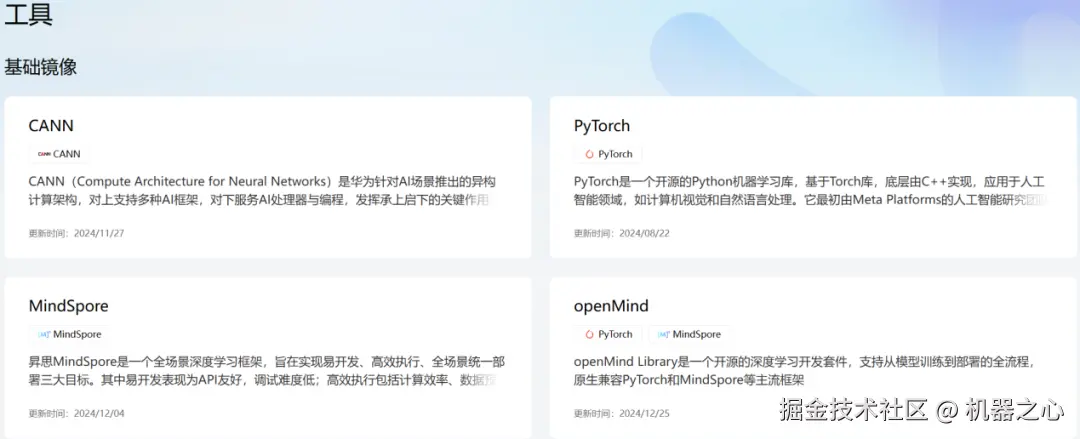 第一件事,是把原来的「镜像中心」升级为「工具中心」,位置也从「更多」菜单一跃来到首页 C 位,对标模型库、数据集 ——