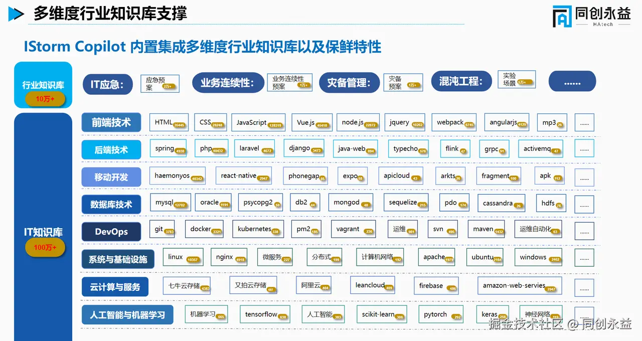 开发运维知识宝典内置知识库内容覆盖 IT 领域数十个大类、2000 多个技术项,包含 100 万 + 条目。知识库还会按季度 / 年度持续更新迭代。