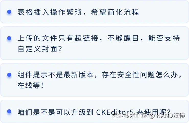项目背景和需求 某 HR 公司用富文本组件维护对外新闻资讯,之前一直被三个问题困扰: 问题01:用表格调整文章布局时,每次都要手动填行列数,切重复编辑非常繁琐; 问题02:文章中的招聘简章、政策文件只有超链接,不够醒目,读者经常错过关键信息; 问题03:需要支持维护多语言,中英文新闻要分开维护,偶尔同步不及时,还会出现内容不一致的问题。