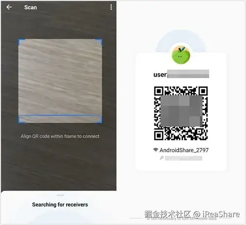 在新手机上打开 SHAREit,然后点击“接收”。新手机将开始扫描发送方。如果发送方设备上显示二维码,请使用接收方手机扫描。否则,请等待发送方头像出现,然后点击即可连接。