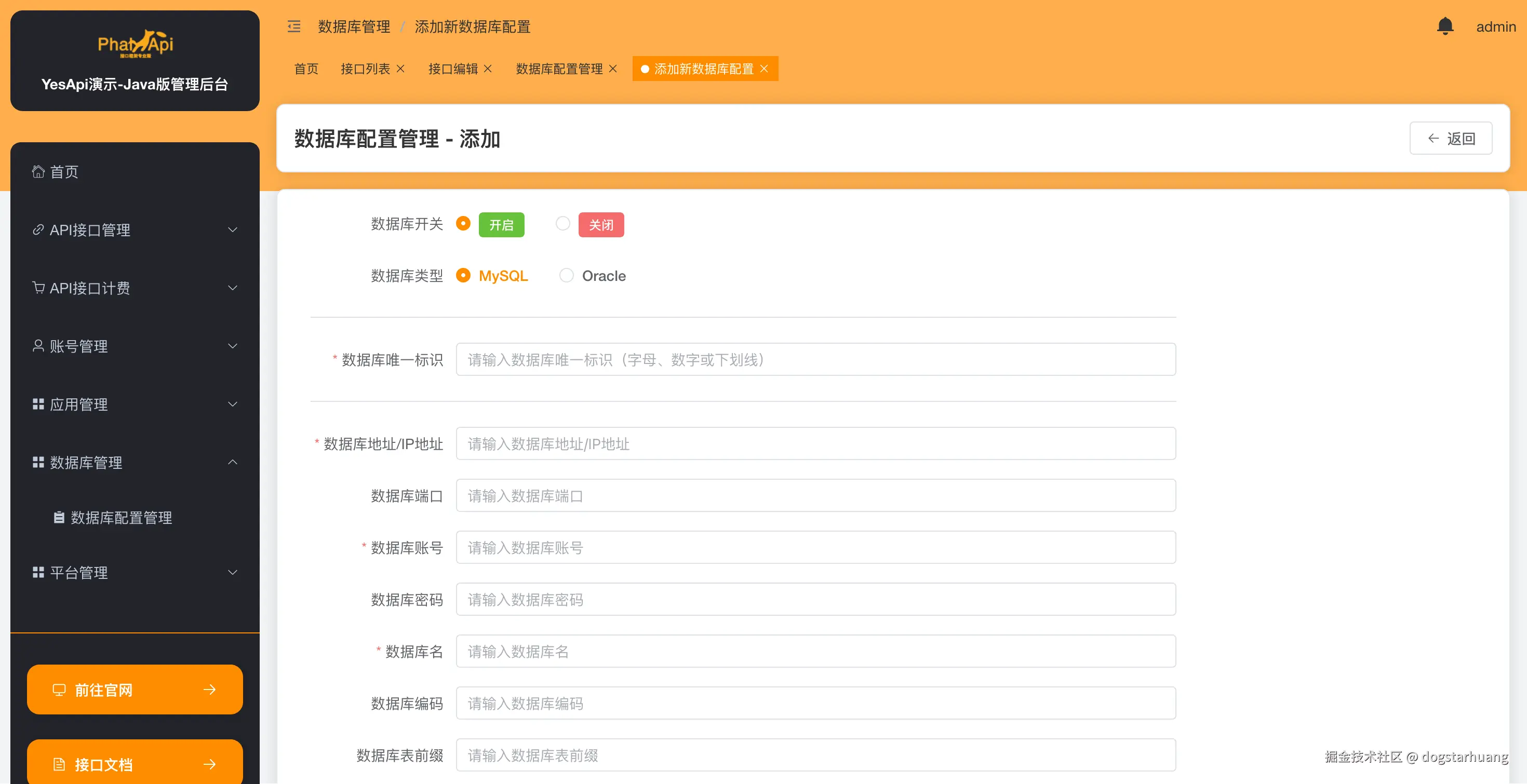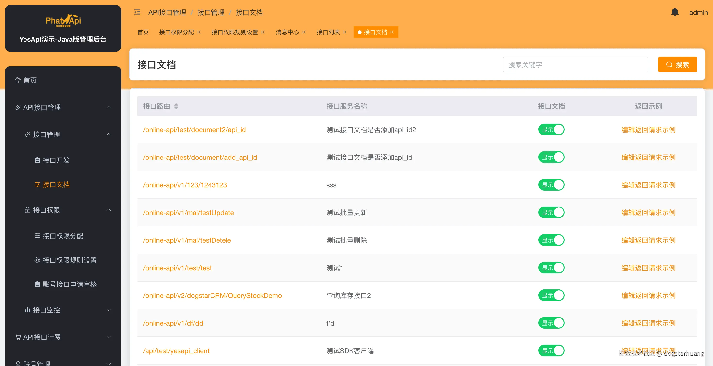 以及API接口文档的维护,包括接口文档的显示与隐藏、接口调用示例配置等。