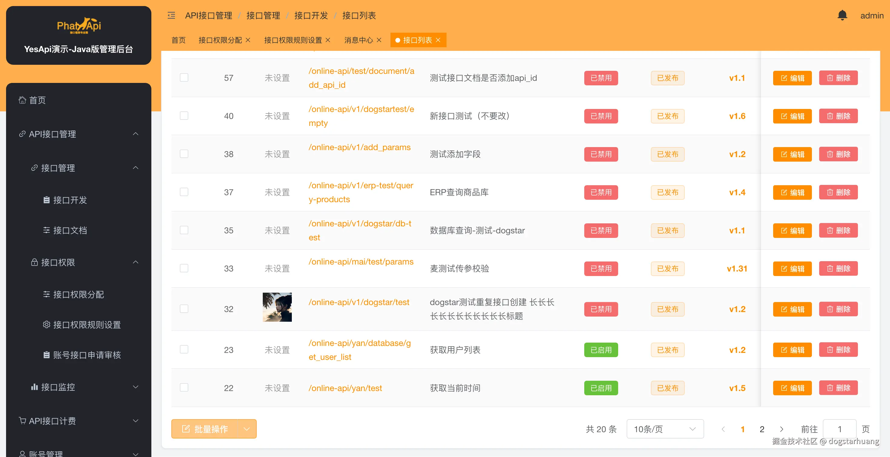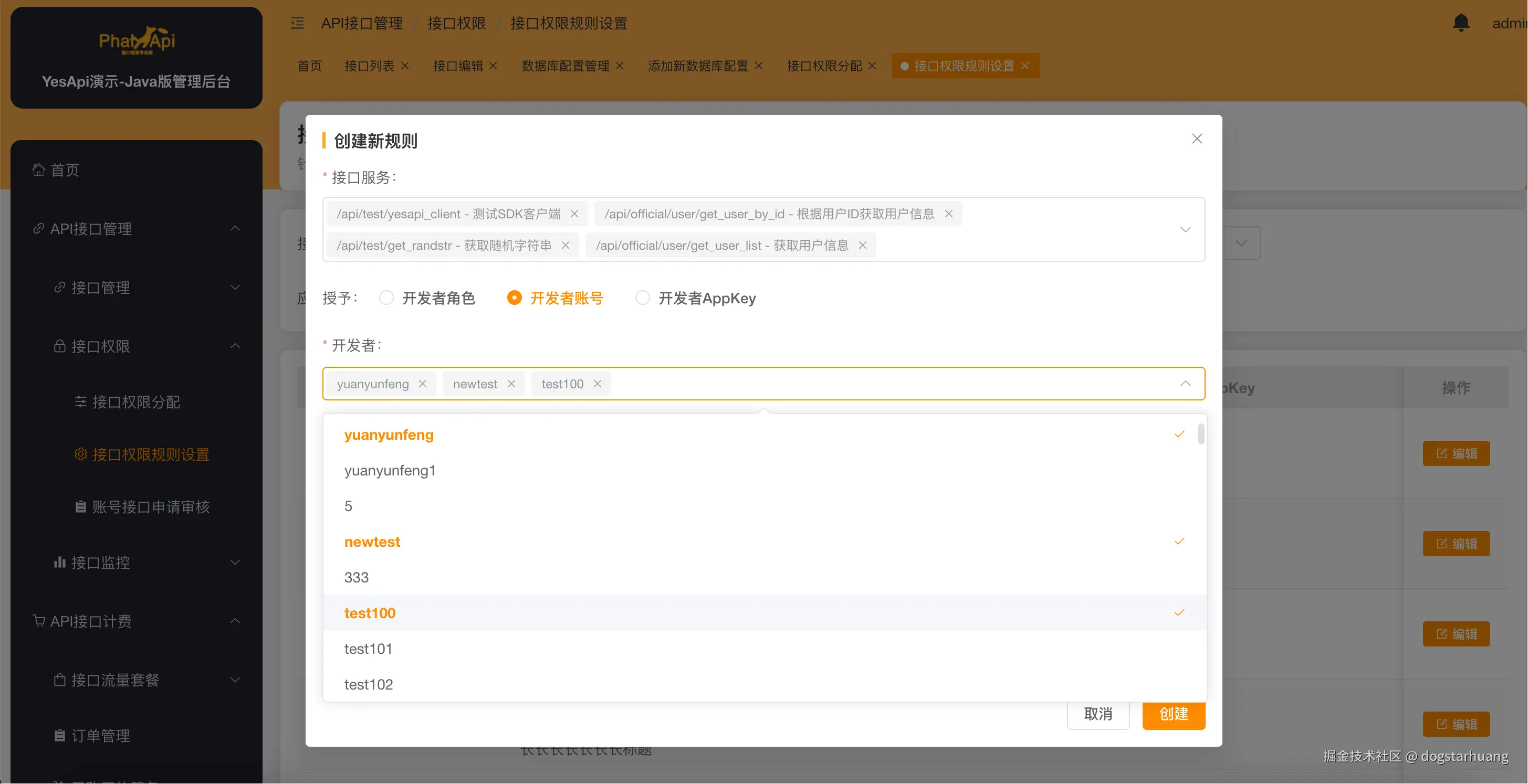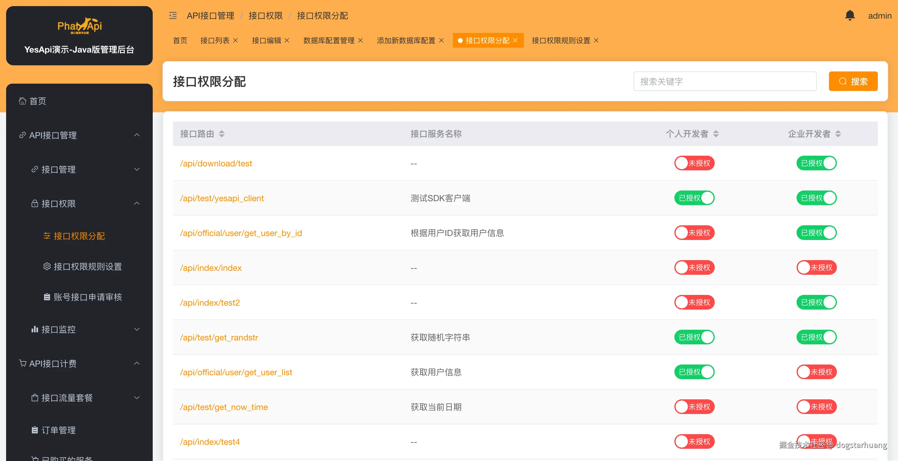 6、升级:管理后台接口权限分配,支持批量操作,批量选中API接口路由,以及批量授权给开发者账号,同时支持快速搜索。