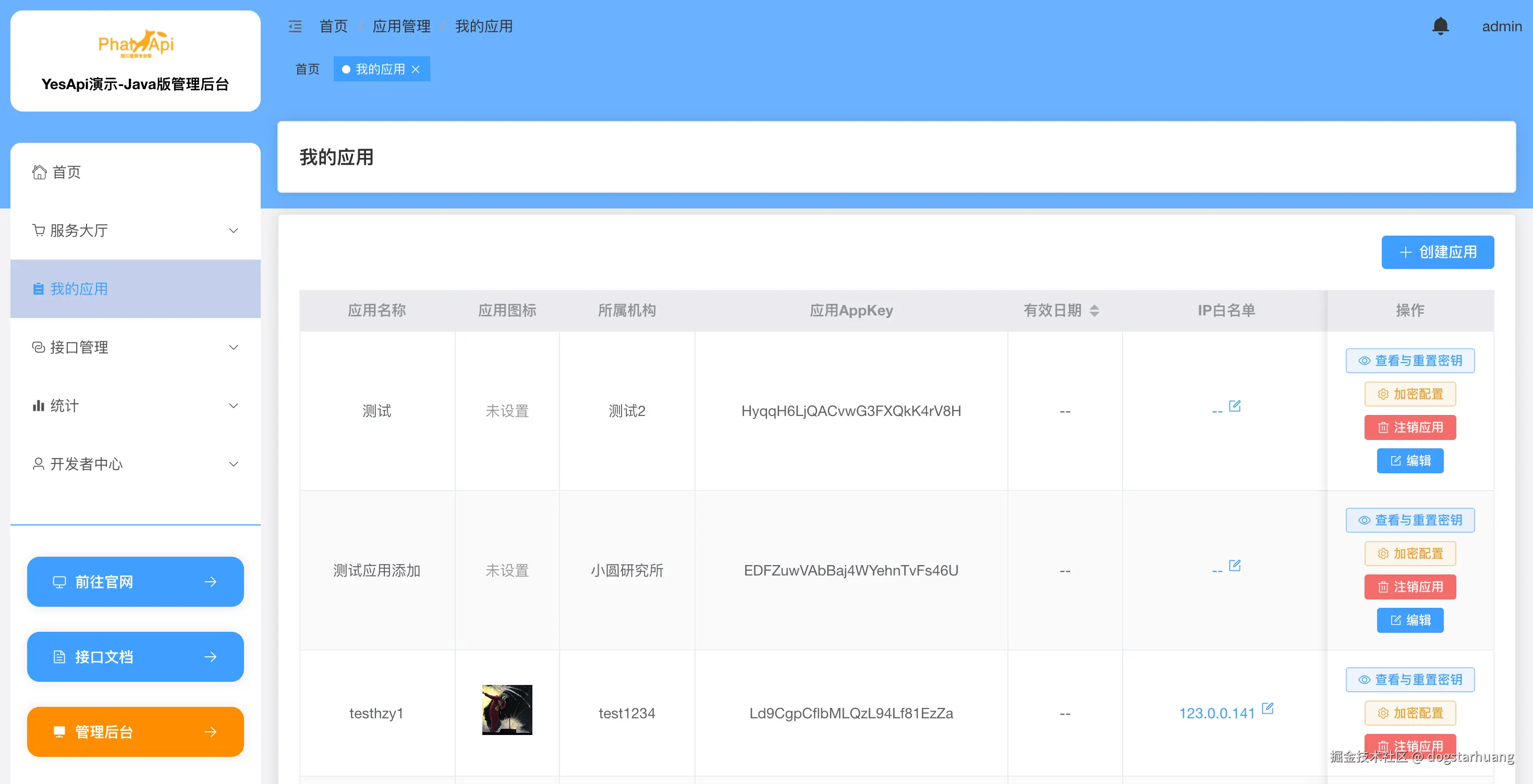 开发者,我的应用管理,包括应用的创建申请、接口加密设置、IP白名单、IP黑名单等自助设置。