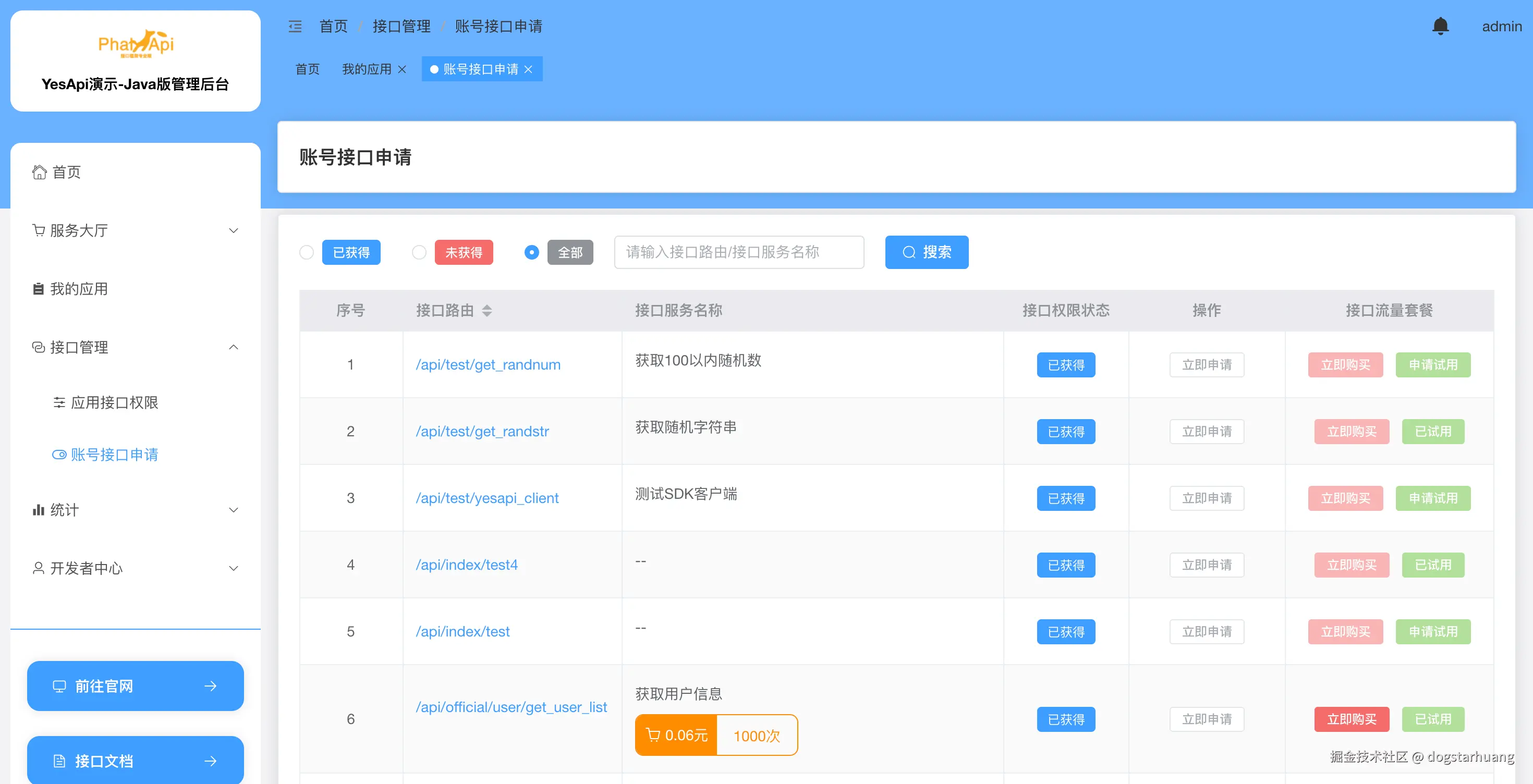 注册即用的接口开放平台,支持:余额充值、接口权限申请、应用创建、我的消息、令牌、接口加密等门户管理