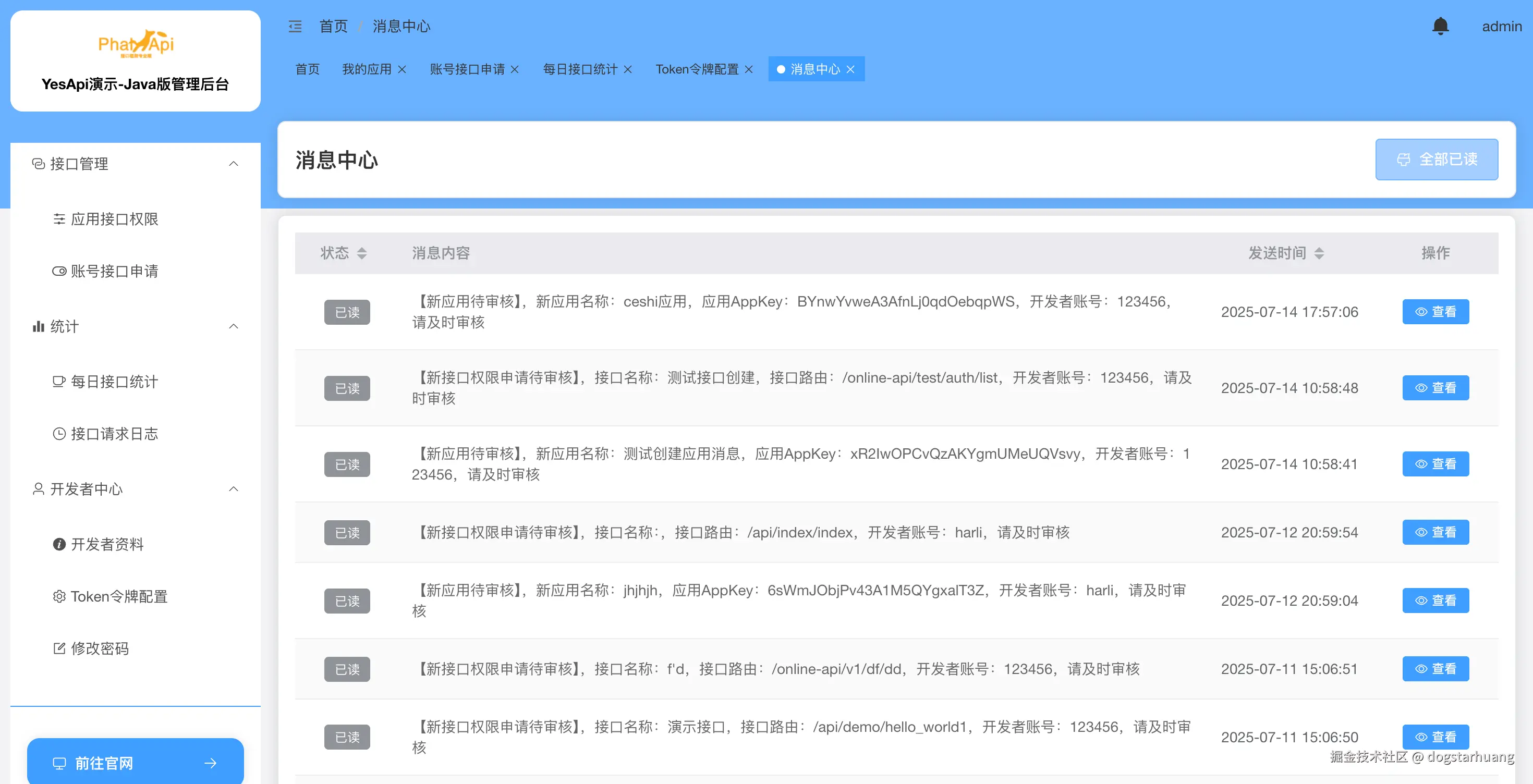 开发者,我的消息通知。及时查看应用审核、接口审核是否通过。