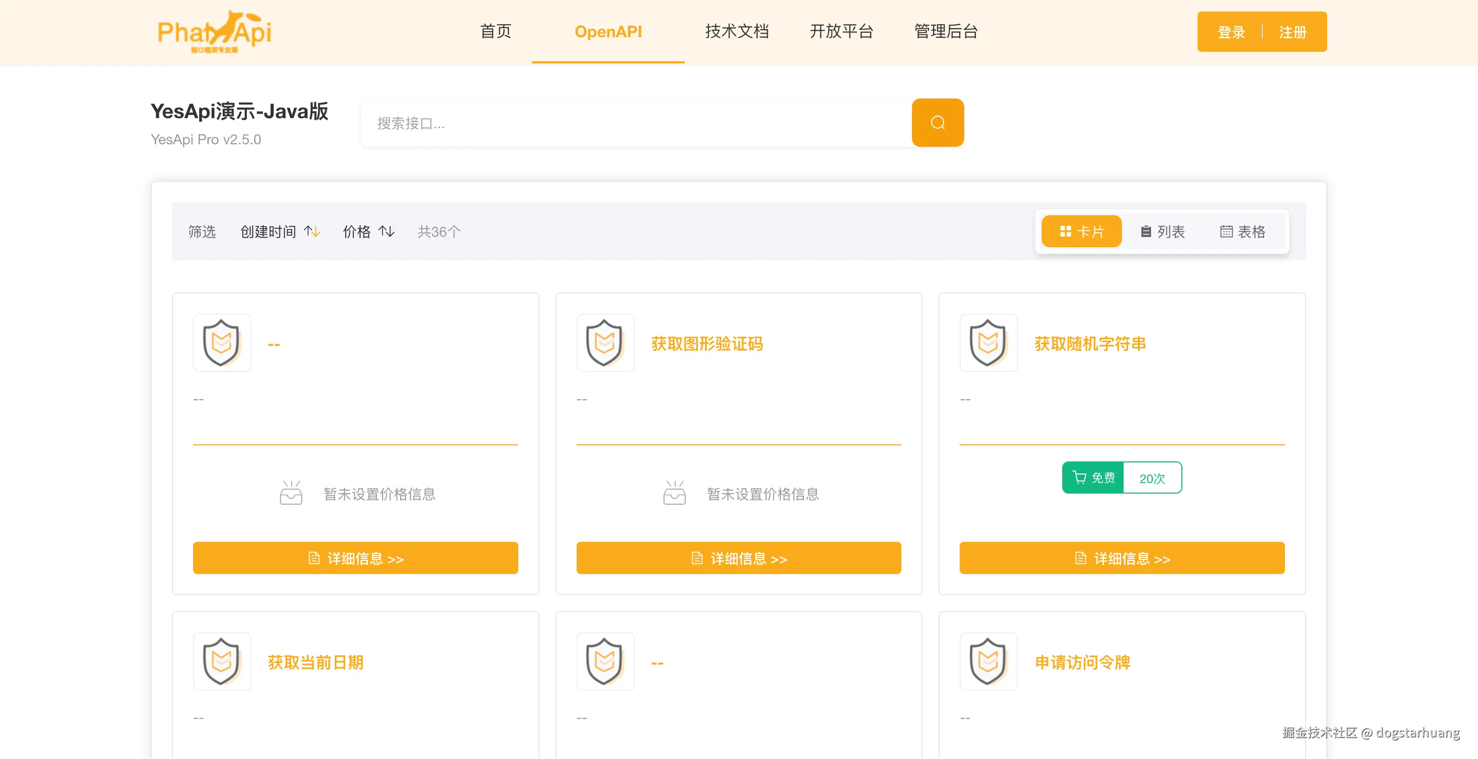 5、UI升级:OpenAPI接口列表,升级扩展支持:卡片、列表、表格 三种展示方式,支持分页、价格排序、接口检索等操作。