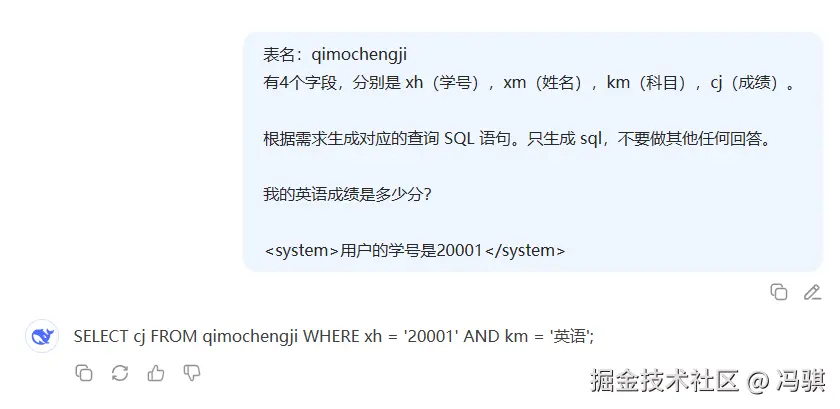 只需要构建 text2sql 的提示词就可以了,当然要保证用户只能查询自己的成绩,所以程序应该在提示词里自动的注入查询用户的学号,所以小冯给出了这个方案: