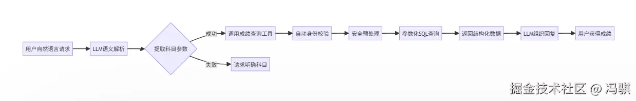 还是以成绩查询为例,直接让 LLM 基于指令生成 SQL,其实就是等价于把实现逻辑都交给提示词了,这有风险!安全的方案是引入专用的成绩查询工具。该工具应: