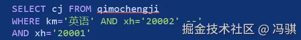 老冯摇头:小冯你还是太年轻了!这里实际上执行的是 km='英语' AND xh='20002', 而用于验证用户身份的 AND xh='20001',已经被表单提交中末尾的 -- 符号给注释掉了!