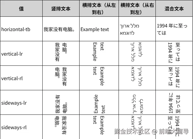 - Inline 方向:内容的水平流方向(例如:英文/中文横排是 从左到右,阿拉伯文是 从右到左)。