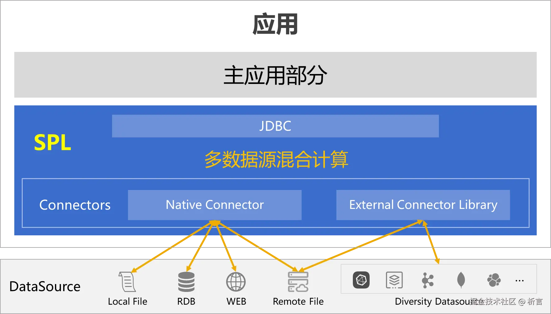 SPL 的数据源连接器分为两种:原生连接器和外部连接器。最常见的 RDB,文本、Excel、JSON 等本地文件,以及 HTTP 数据源等都属于原生连接器,内置在 SPL 核心体系中。而其他多样性数据源,如 MongoDB、Kafka、ElasticSearch、云存储都属于外部连接器,不在 SPL 核心体系内,需要另外部署。