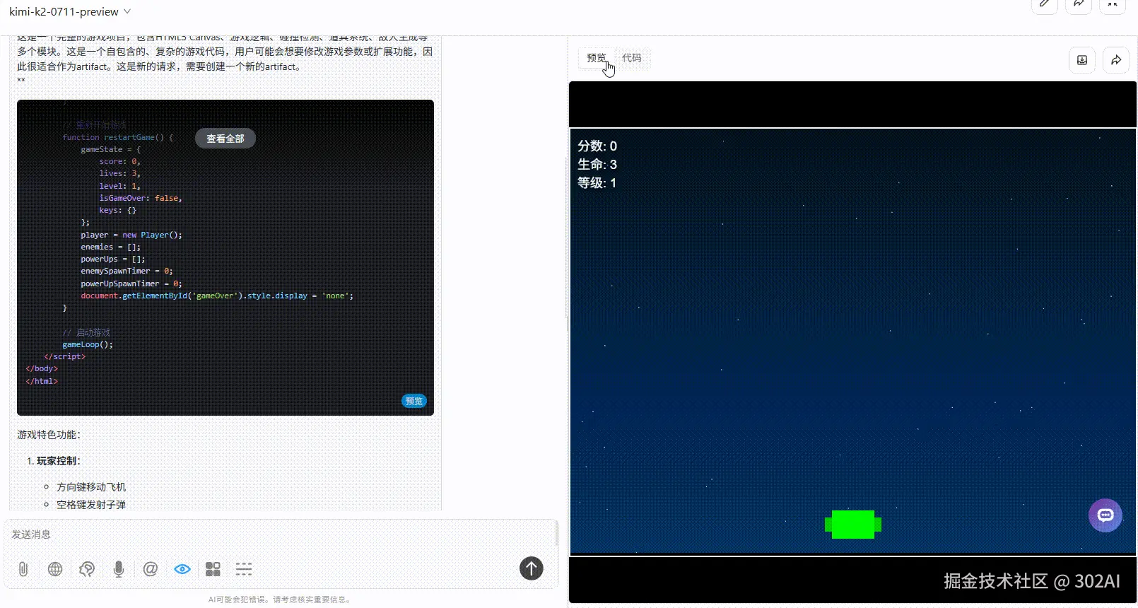 在处理如《飞机大战》游戏这类高度综合性、涉及复杂交互逻辑和游戏机制的任务时,Kimi K2 的表现仍有提升空间。 虽然能生成基础框架,但在细节完善、可玩性以及整体架构方面,距离一个即插即用的完整解决方案尚有距离。