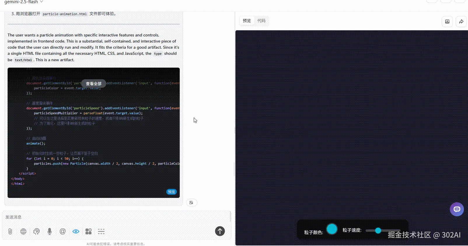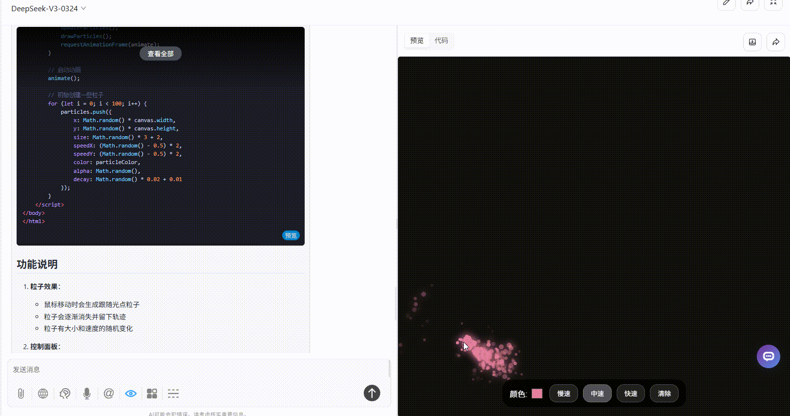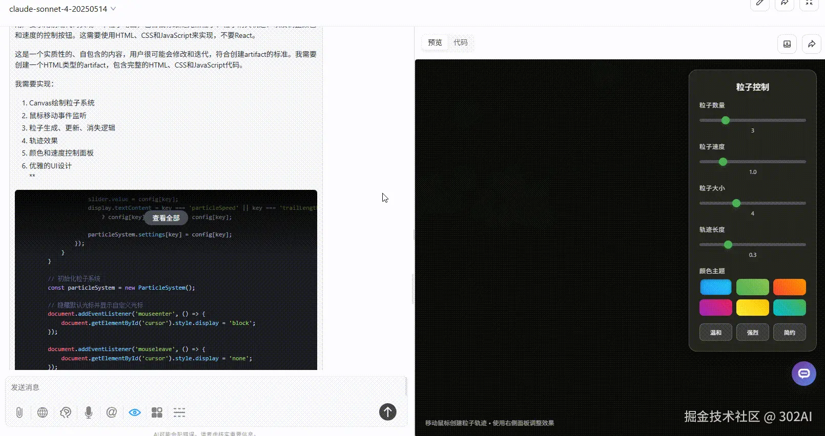 claude-sonnet-4:粒子 6 种渐变色预设可选,设计感强。除了提示词要求的颜色和速度的按钮,还提供了更多粒子细节调整(大小,数量,轨迹长度),功能丰富度最高,效果最佳。