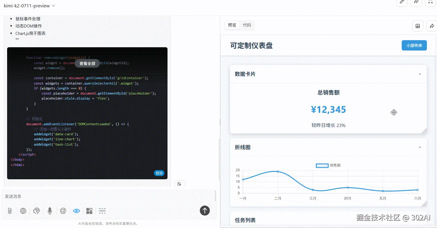 kimi-k2 :能够添加删除、拖放小部件,且能够调整大小,但是调整大小后不能将小部件拖放到右侧摆放。