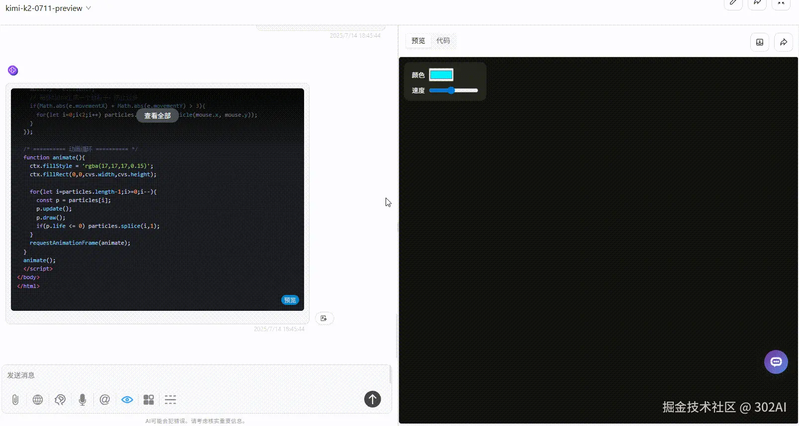 Kimi K2:基本遵循提示词要求生成,RGB 自定义颜色,速度可调,粒子轨迹类似弹簧的效果,与其他模型生成的效果均不同,总体完成度较高。