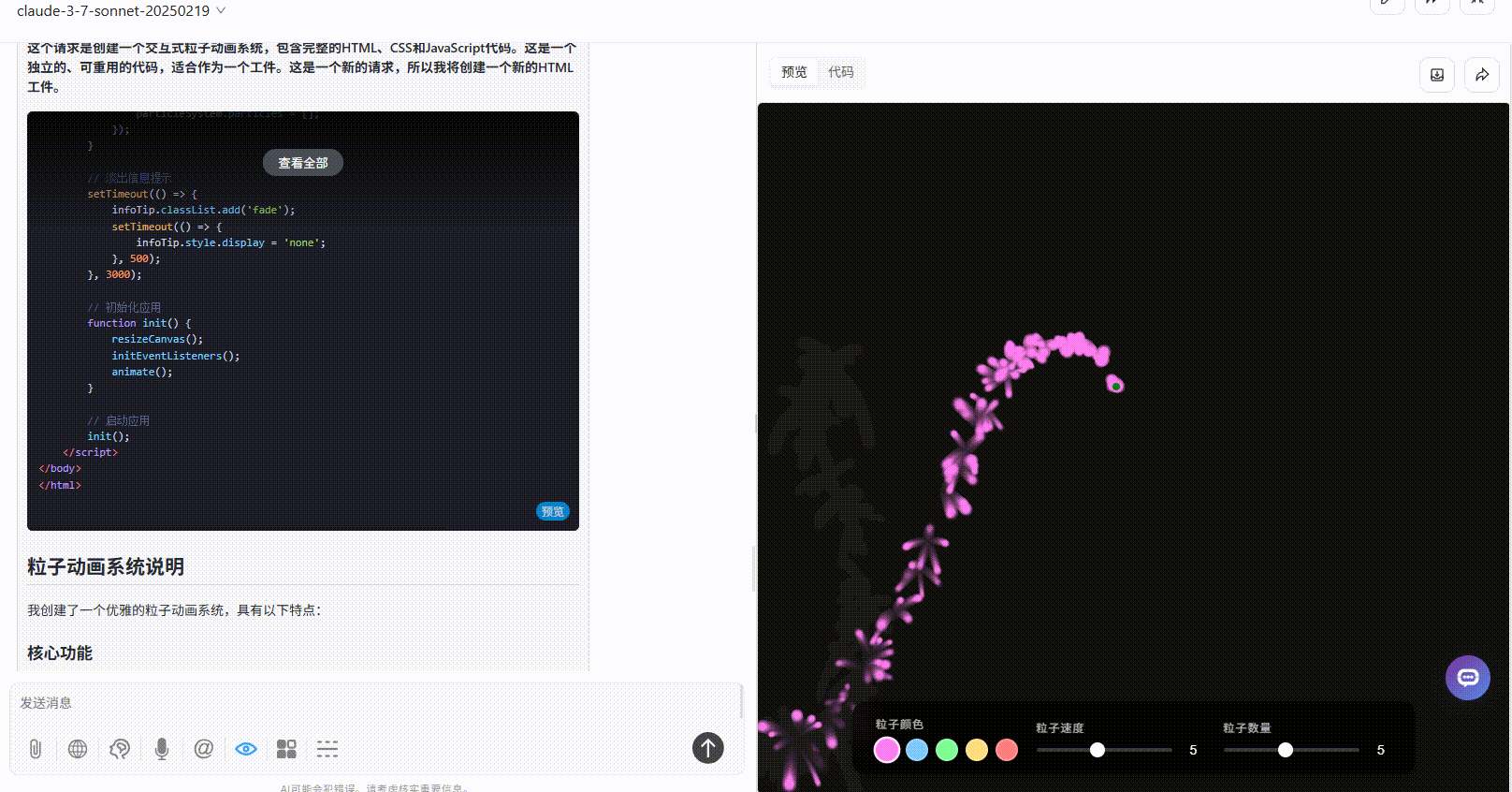 claude-3-7-sonnet:鼠标移动触发粒子时无明显延迟,跟随轨迹连贯,整体例子效果较好但仅 5 色可选。