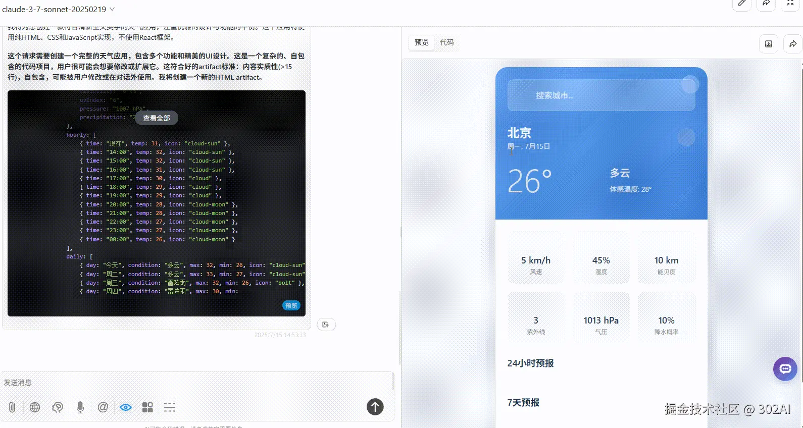 claude-3-7-sonnet:设计风格使用单色,视觉简洁,24 小时预报板块的内容欠缺,完整度不够。