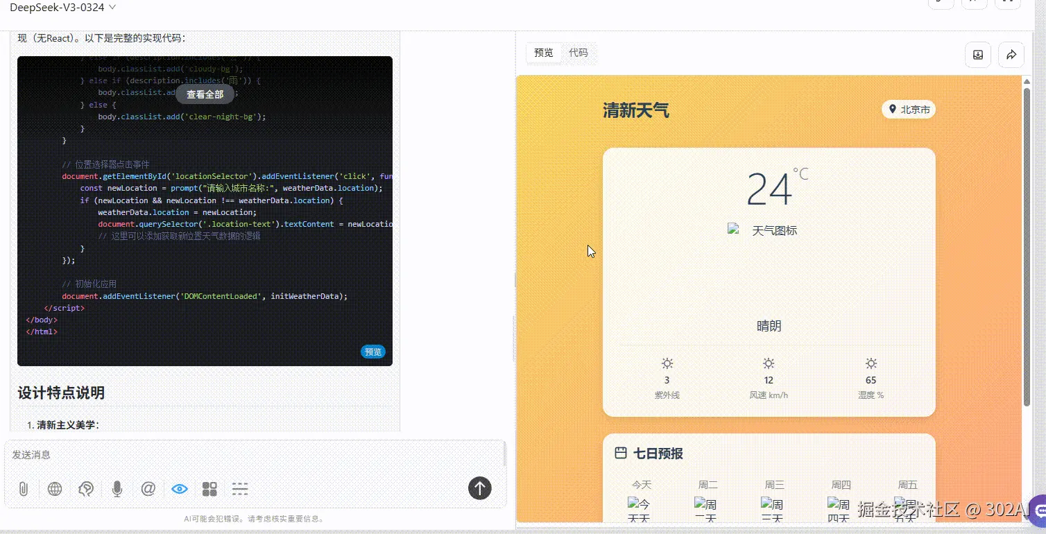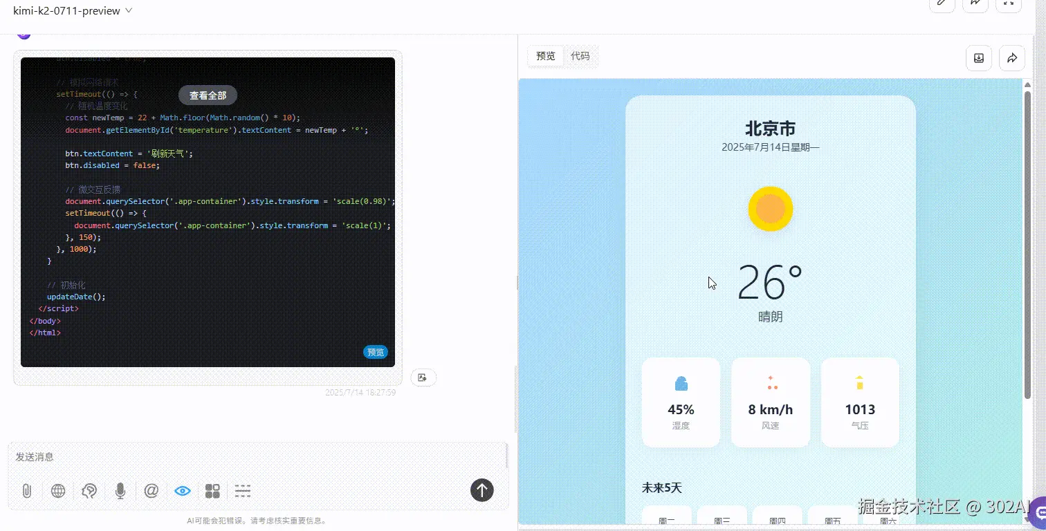 首先,Kimi K2 在通用代码生成任务中展现出令人惊喜的实力,尤其在创意性及视觉化代码方面,表现远超同级别的 gemini-2.5-flash 和 DeepSeek-V3。 无论是复杂的粒子动画效果,还是精美的天气应用 UI 设计,Kimi K2 都能准确理解提示词意图,并生成高质量、符合美学标准的输出,其视觉表现力令人印象深刻,无疑是本次测试中的一大亮点。这表明 Kimi K2 在特定场景下,已具备成为开发者高效助手的强大潜力。