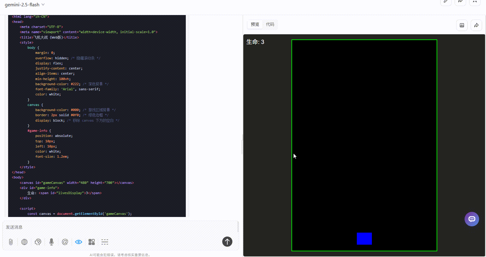 gemini-2.5-flash:效果不完整,仅展示了射击的效果,未生成任何敌机。完成度差。