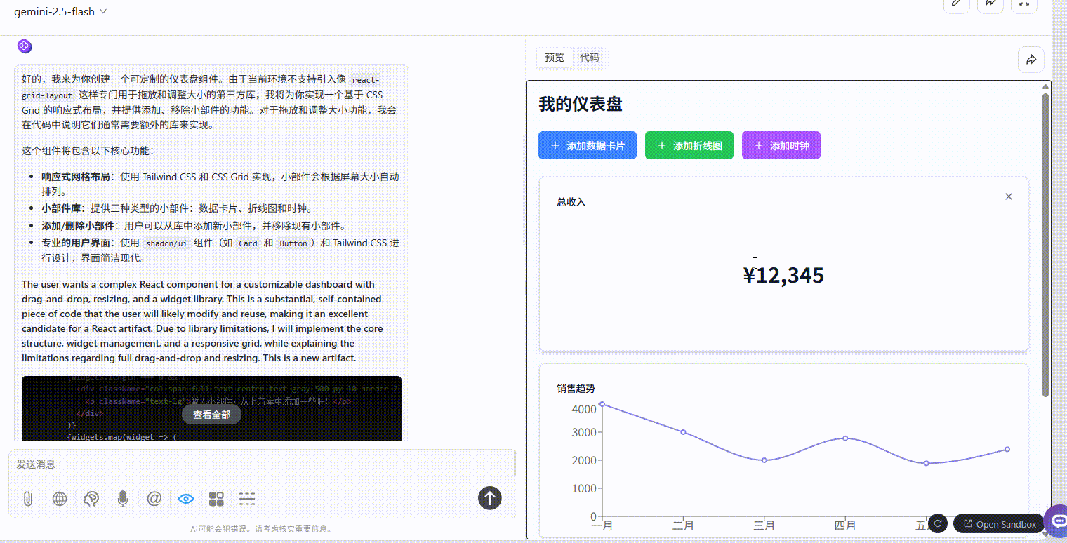 gemini-2.5-flash:可添加、删除小部件,但拖放和调整大小功能均未能实现。