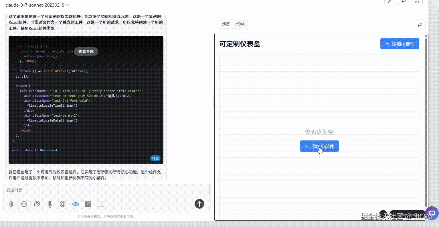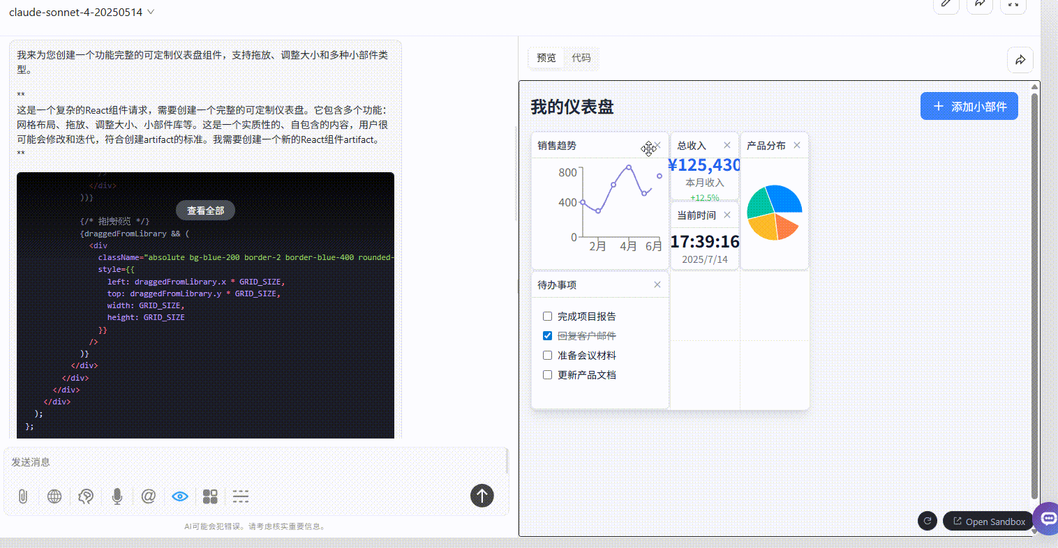 claude-sonnet-4:能够添加、删除、拖放小部件,但是限制了摆放框的大小,无法自由调整大小。