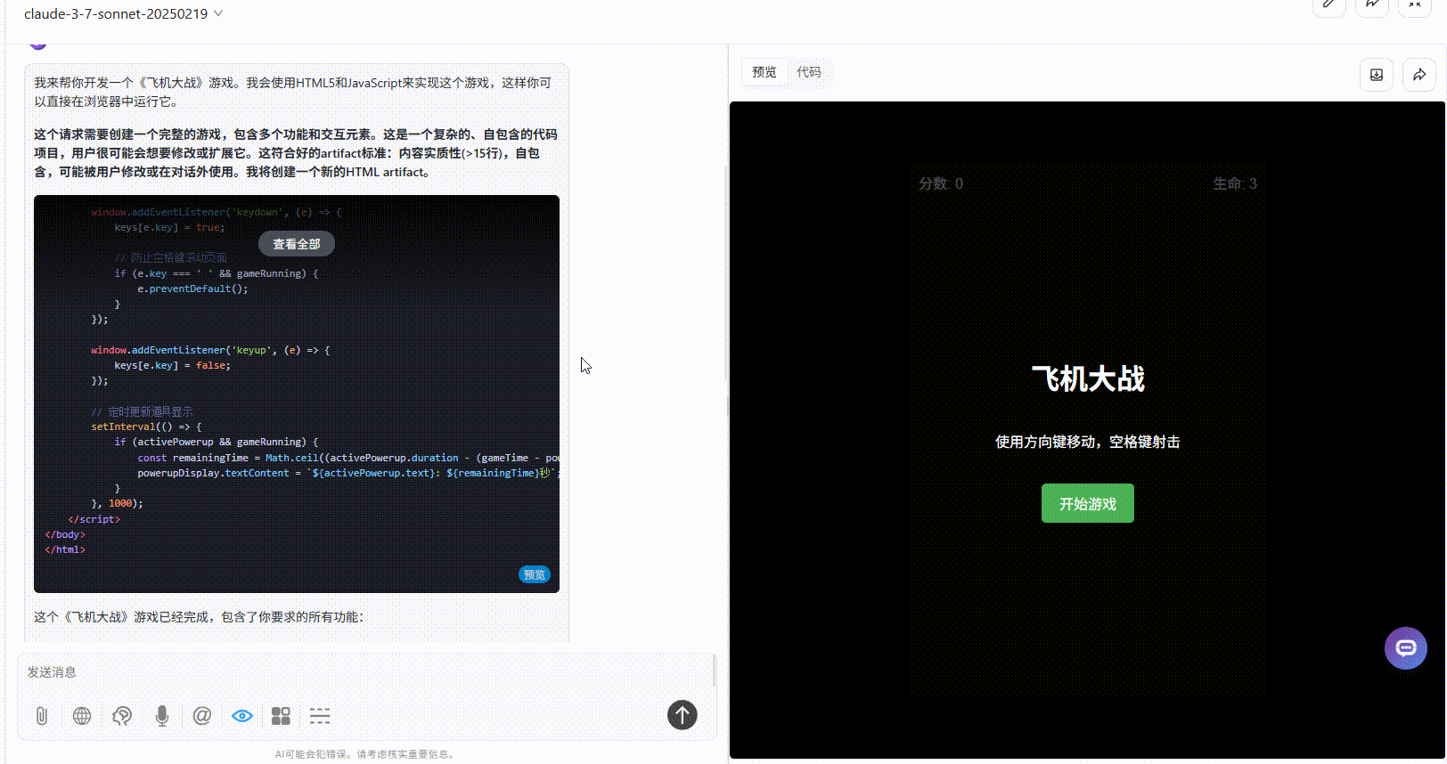 claude-3-7-sonnet:游戏基础设定正常,背景有星空粒子效果,成功击败敌机后分数增加,生成随机道具,但也存在移动操作灵敏度问题。整体完成度较佳。