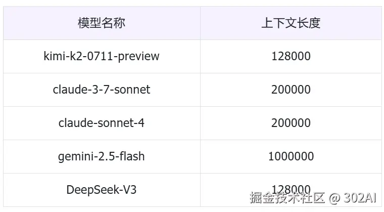 参与对比的模型所支持的上下文长度一览表: