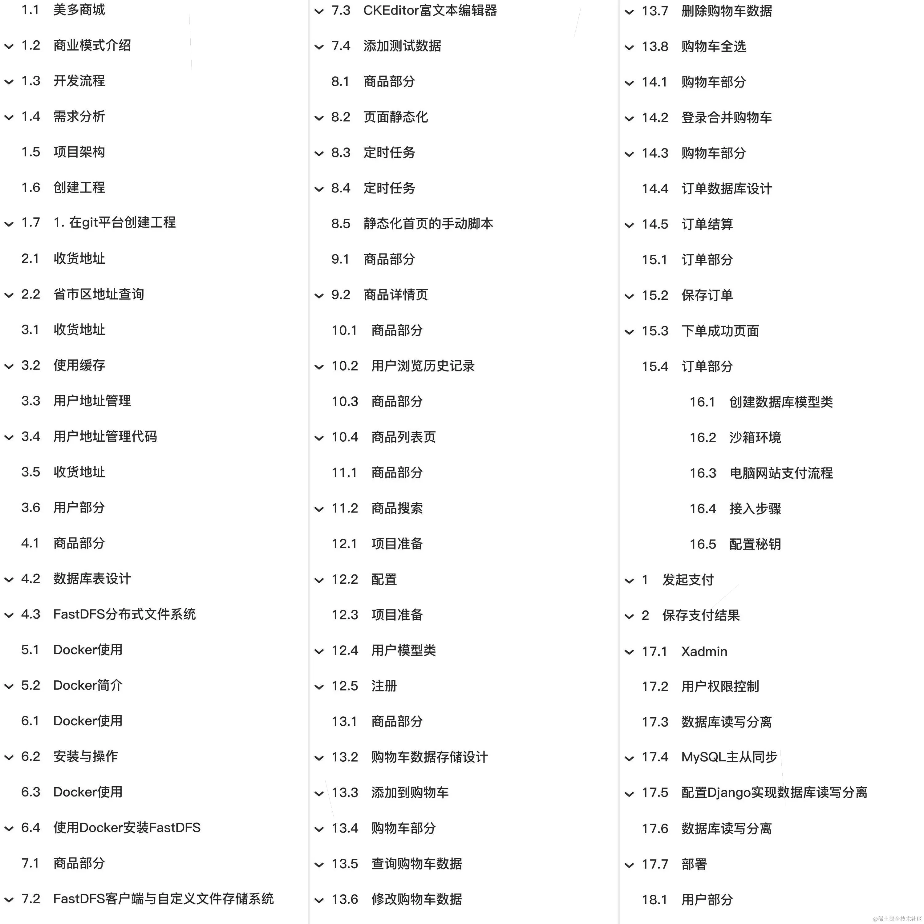 教程总体简介:美多商城、商业模式介绍、开发流程、需求分析、项目架构、创建工程、1. 在git平台创建工程、收货地址、省市区地址查询、使用缓存、用户地址管理、用户地址管理代码、用户部分、商品部分、数据库表设计、FastDFS分布式文件系统、Docker使用、Docker简介、安装与操作、使用Docker安装FastDFS、FastDFS客户端与自定义文件存储系统、CKEditor富文本编辑器、添加测试数据、页面静态化、定时任务、静态化首页的手动脚本、商品详情页、用户浏览历史记录、商品列表页、商品搜索、项目准备、配置、用户模型类、注册、购物车数据存储设计、添加到购物车、购物车部分、查询购物车数据、修改购物车数据、删除购物车数据、购物车全选、登录合并购物车、订单数据库设计、订单结算、订单部分、保存订单、下单成功页面、发起支付、保存支付结果、Xadmin、用户权限控制、数据库读写分离、MySQL主从同步、配置Django实现数据库读写分离、部署、图片验证码、短信验证码、跨域CORS、使用Celery完成发送短信、判断帐号是否存在、JWT、什么是JWT、Django REST framework JWT、登录、绑定用户身份接口、用户中心个人信息、邮件与验证、使用Django发送邮件、保存邮箱并发送验证邮件、验证邮箱链接