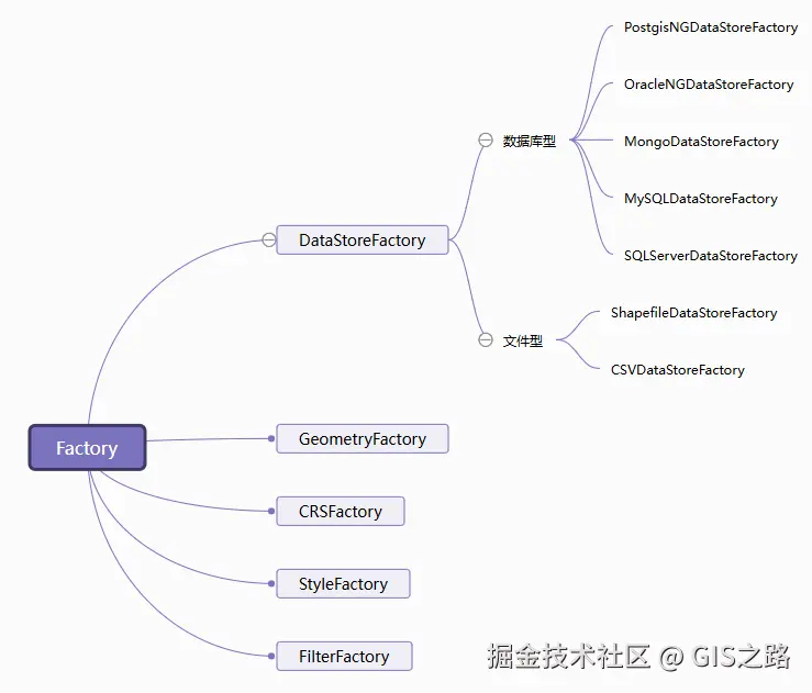 GeoTools的设计也采用了工厂设计模式的思想,用于创建地理空间数据处理中的各种对象。使得其面对各种地理数据格式时,可以灵活拓展。