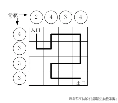 按习俗,骑士要从西北角走到东南角。可以横向或纵向移动,但不能斜着走,也不能跳跃。每走到一个新方格,就要向正北方和正西方各射一箭。(城堡的西墙和北墙内各有 nn 个靶子)同一个方格只允许经过一次。但不必走完所有的方格。如果只给出靶子上箭的数目,你能推断出骑士的行走路线吗?有时是可以的,比如上图中的例子。