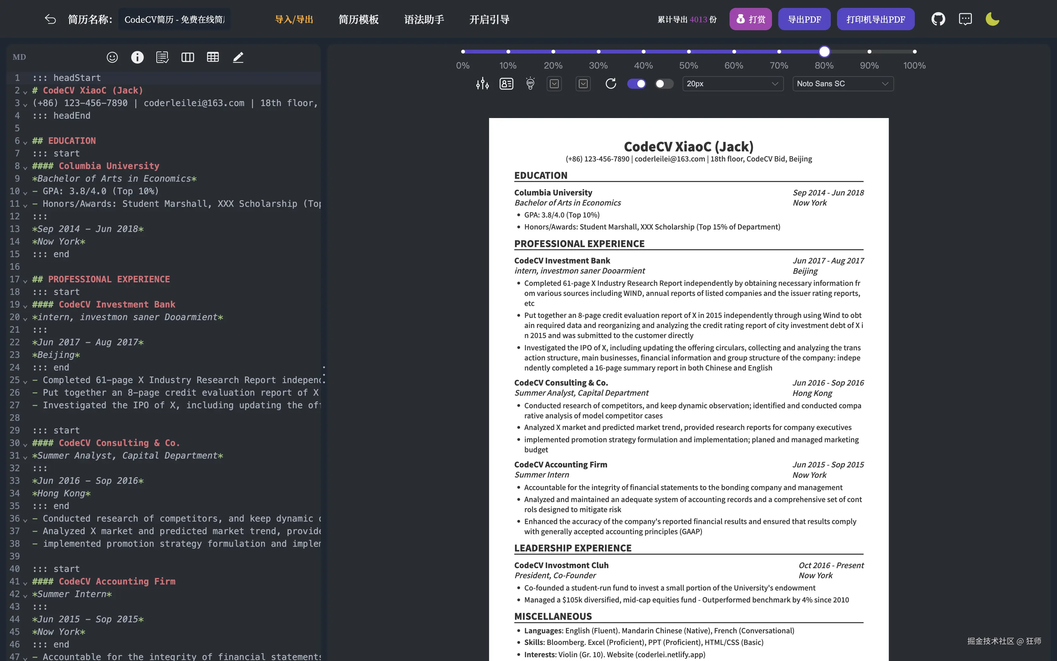 - 支持导入导出 Markdown 文件,方便你备份和修改简历。