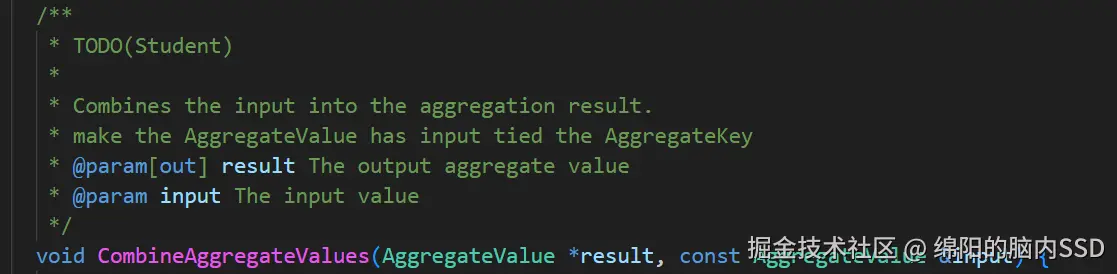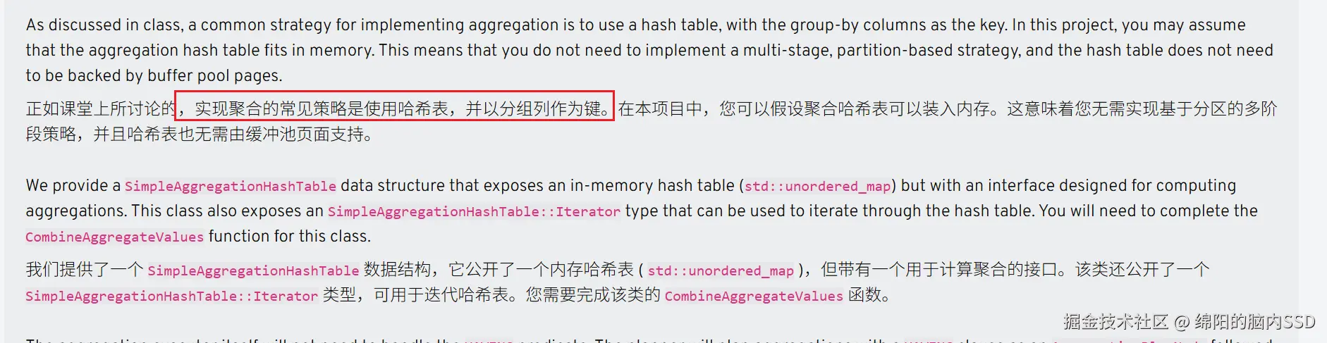 正如文档中所说的, 实现聚合要使用哈希表。 CMU助教们在Aggregation的头文件中已经帮我们把哈希表的框架搭出来了, 在这里我需要实现的核心就是CombineAggregateValues这个函数。