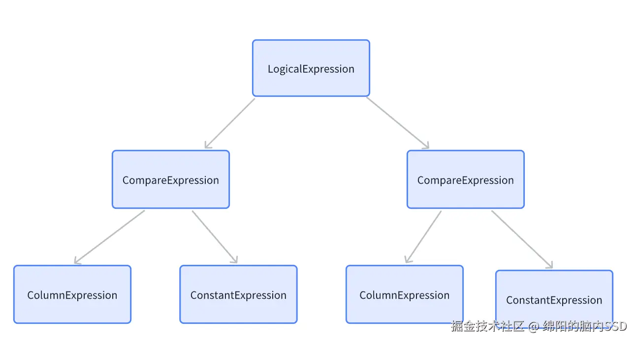 - 对于LogicalExpression, 如果表达式是age > 18 and age < 20这种。 里面的LogType就是and。 然后左子树是一个CompareExpression, 右子树也是一个CompareExpression。同时对于两个比较表达式同上。