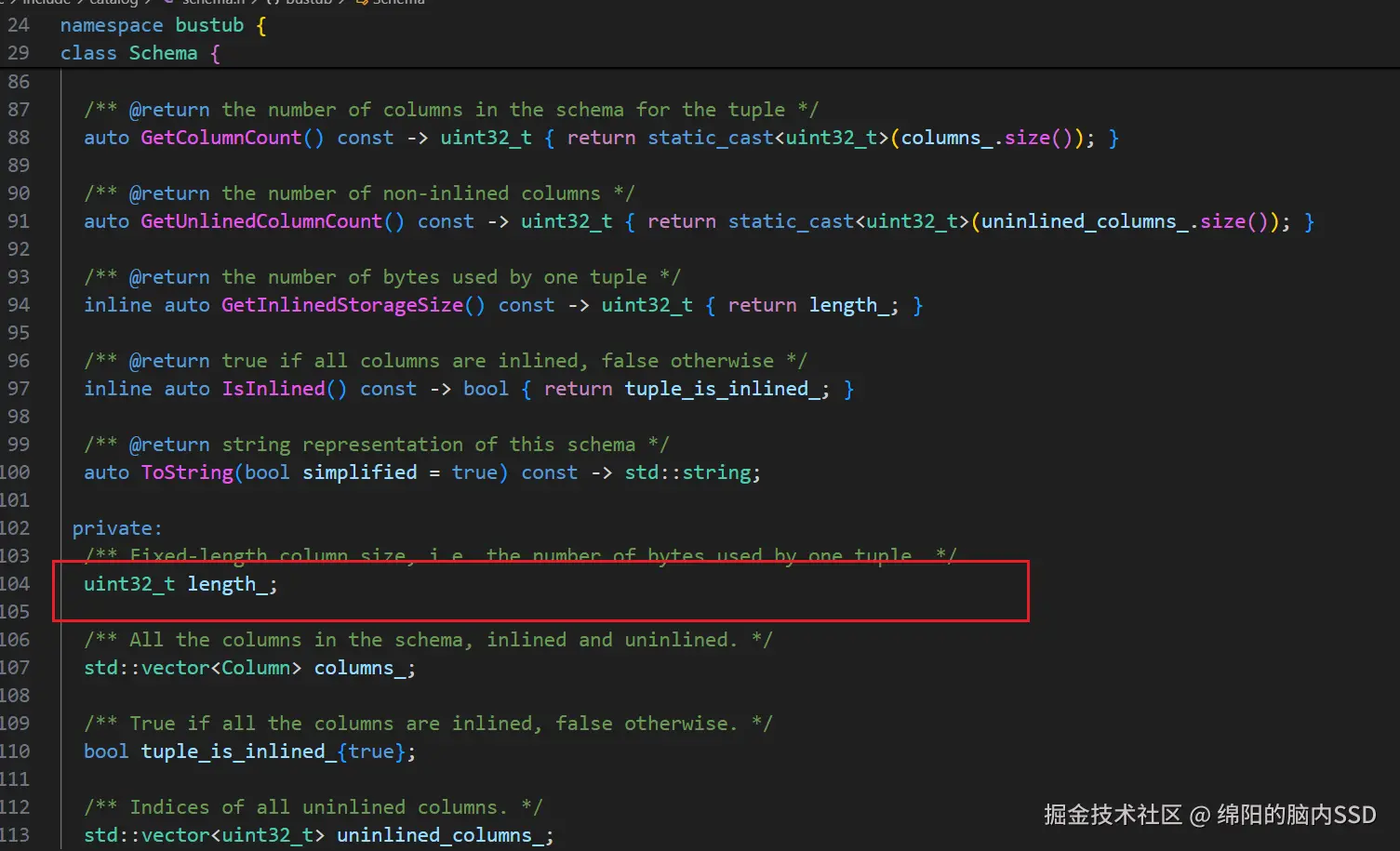 对于Tuple来说, 它的size是sizeof(uint32_t) + schema.length。这个schema.length代表了Tuple内数据的所有列的大小的总和。 但是除了数据的总大小, 还需要在Tuple的头部有一个uint32_t大小的"元数据", "元数据“保存了当前Tuple内数据的大小。也就是说, 如果Tuple内数据的大小为32, 那么Tuple的总大小就是36, 一直要多4个字节。这样做是为了方便序列化。