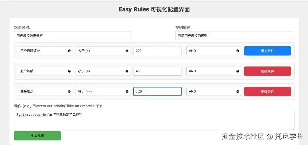 这就是典型规则引擎的应用场景了,工程师不再随着运营人员需求的变更而修改代码,而是给他们一套通用的可配置化的页面,让他们自己去配置。