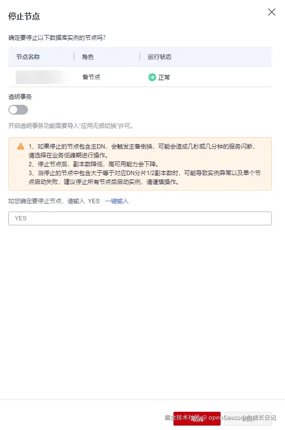 - 如果开启透明事务,在停止节点过程中会降低事务SQL报错风险,会增加一定的停止节点耗时。