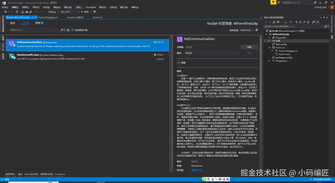 为了方便开发者快速上手,本文使用HslCommunication库来实现与欧姆龙PLC的通信。
