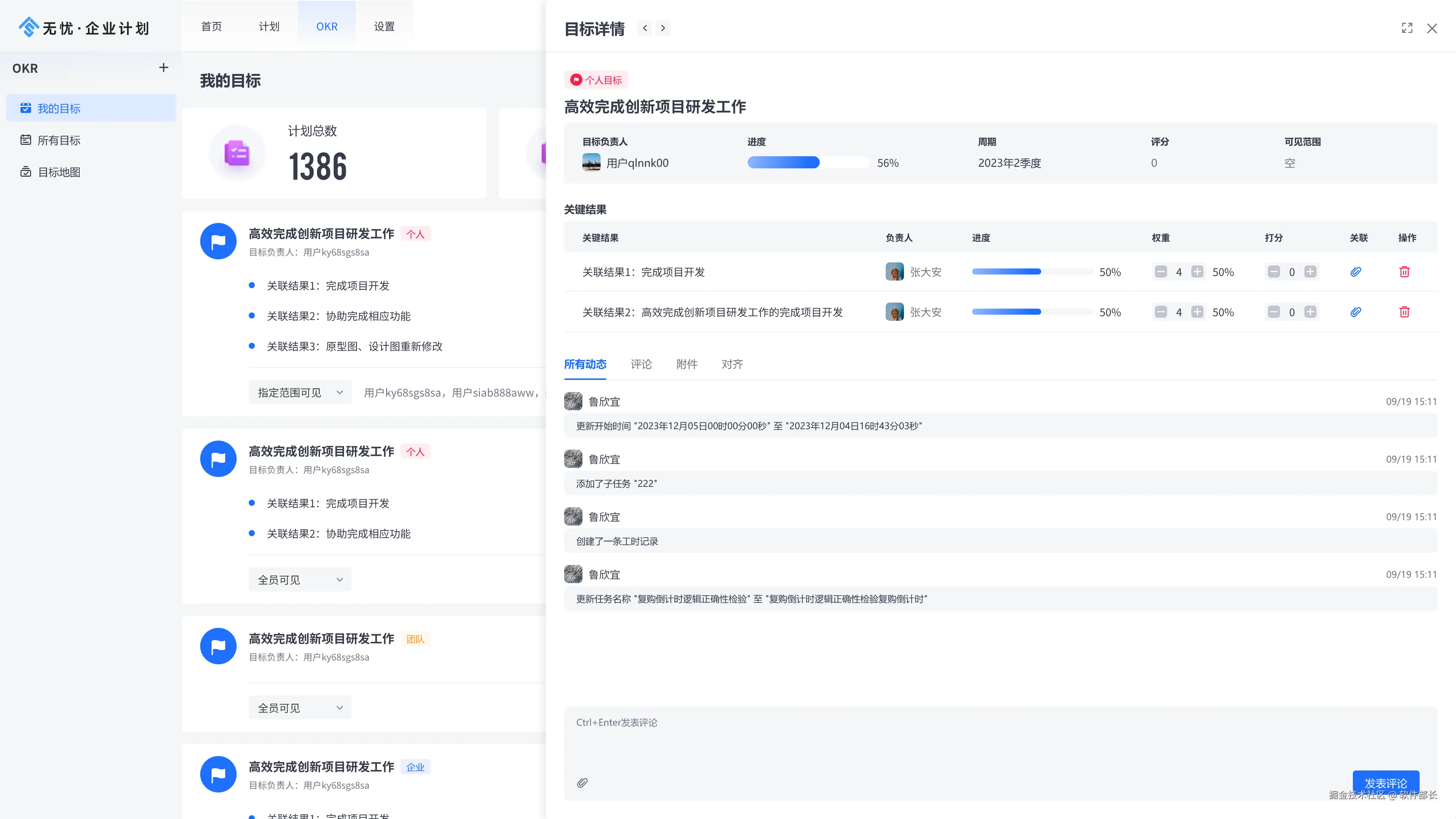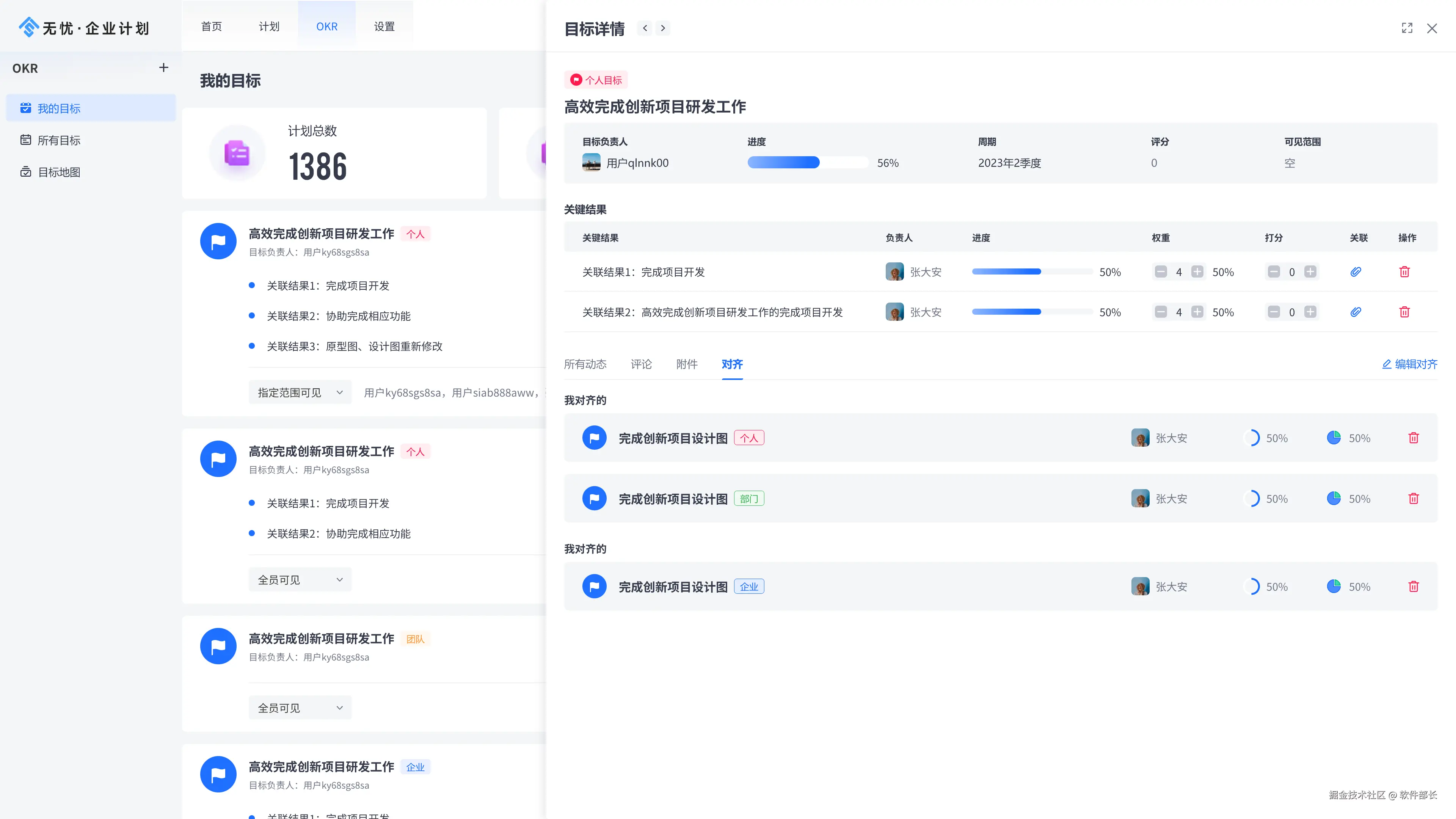 2、OKR我的目标可查看各个目标详情,并且可跟进目标动态,对目标进行评论,查看目标福建,可对目标进行对齐。