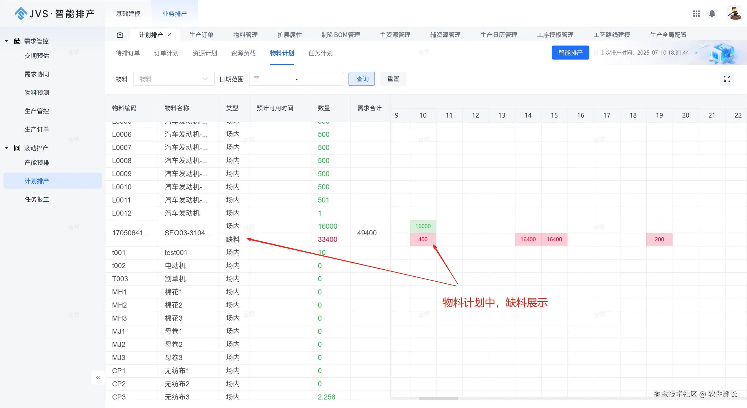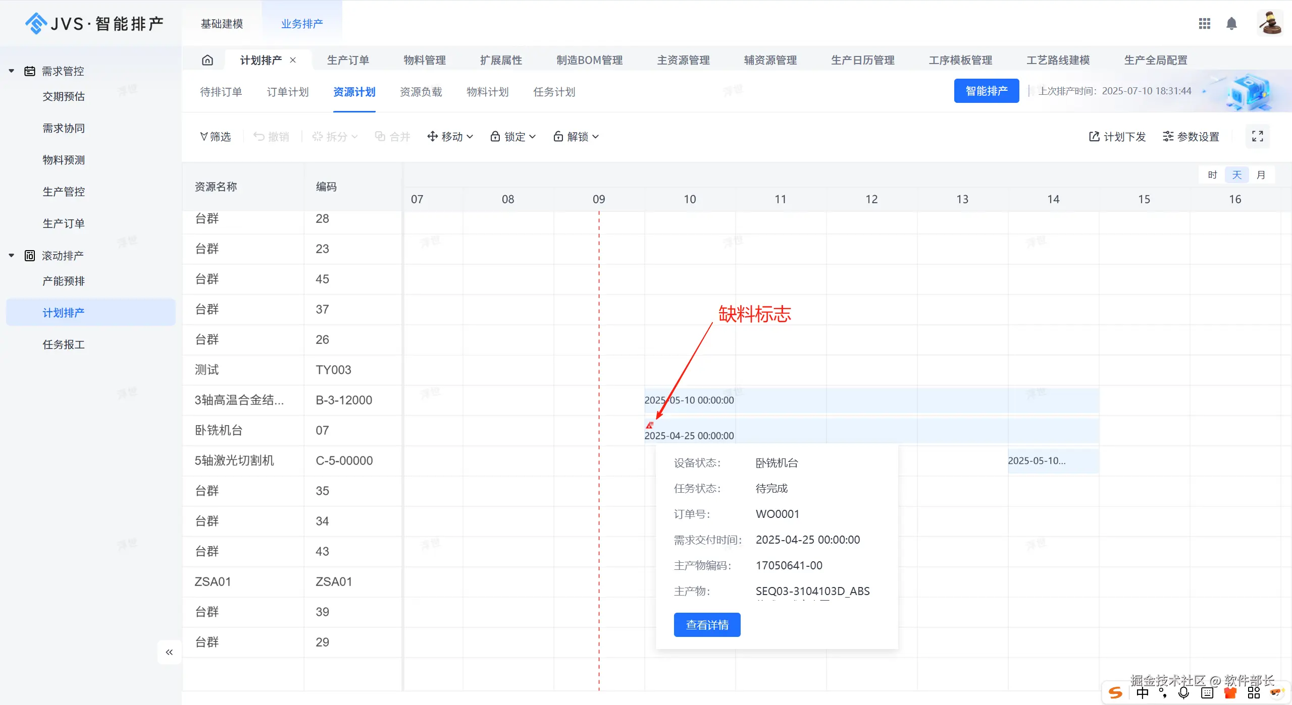 c、排产完成后,将任务下发到MES系统中时,如果开启参与齐套计算,那么会校验物料齐套后才能将任务下发到MES,在资源甘特图上也会展示缺料的图标
