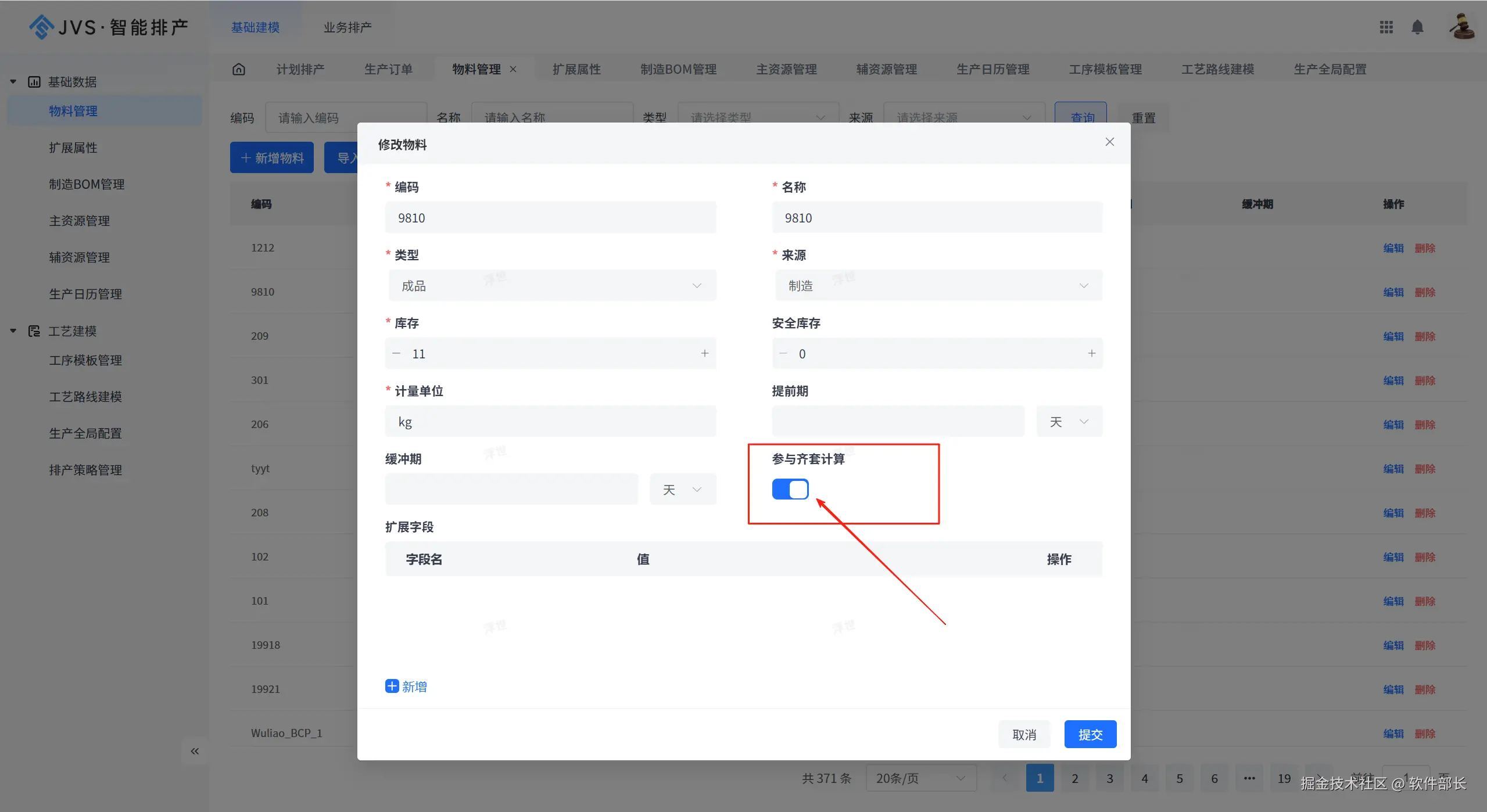 2、优化功能,BOM中不再维护“参与MRP计算”,物料管理中增加“参与齐套计算”开关,通过开关设置可以判断物料是否纳入齐套计算。