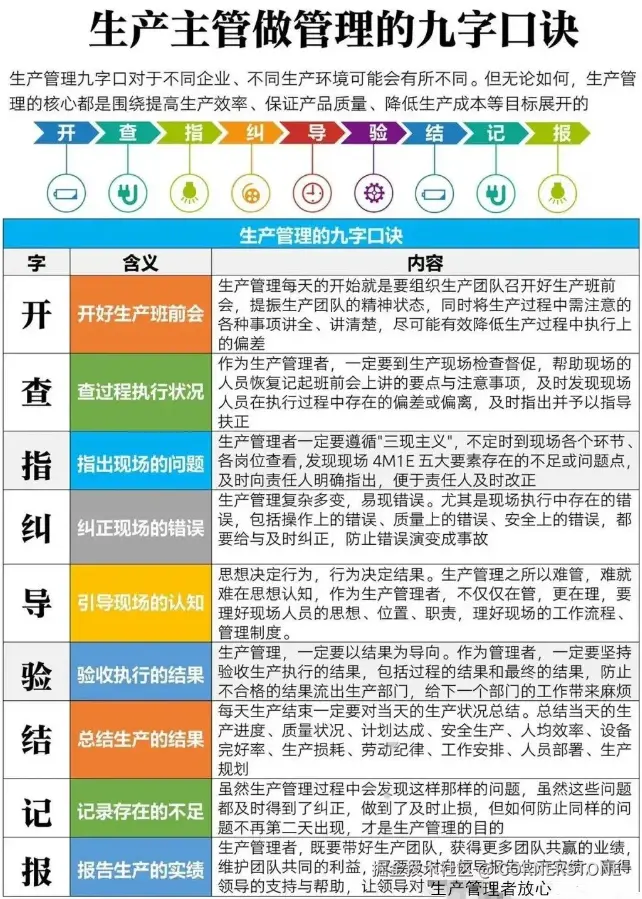 生产主管的管理能力直接影响团队效能,“开、查、指、纠、导、验、结、记、报” 九字口诀,是多年管理经验的浓缩,每一字都蕴含着 “现场管理” 的精髓。