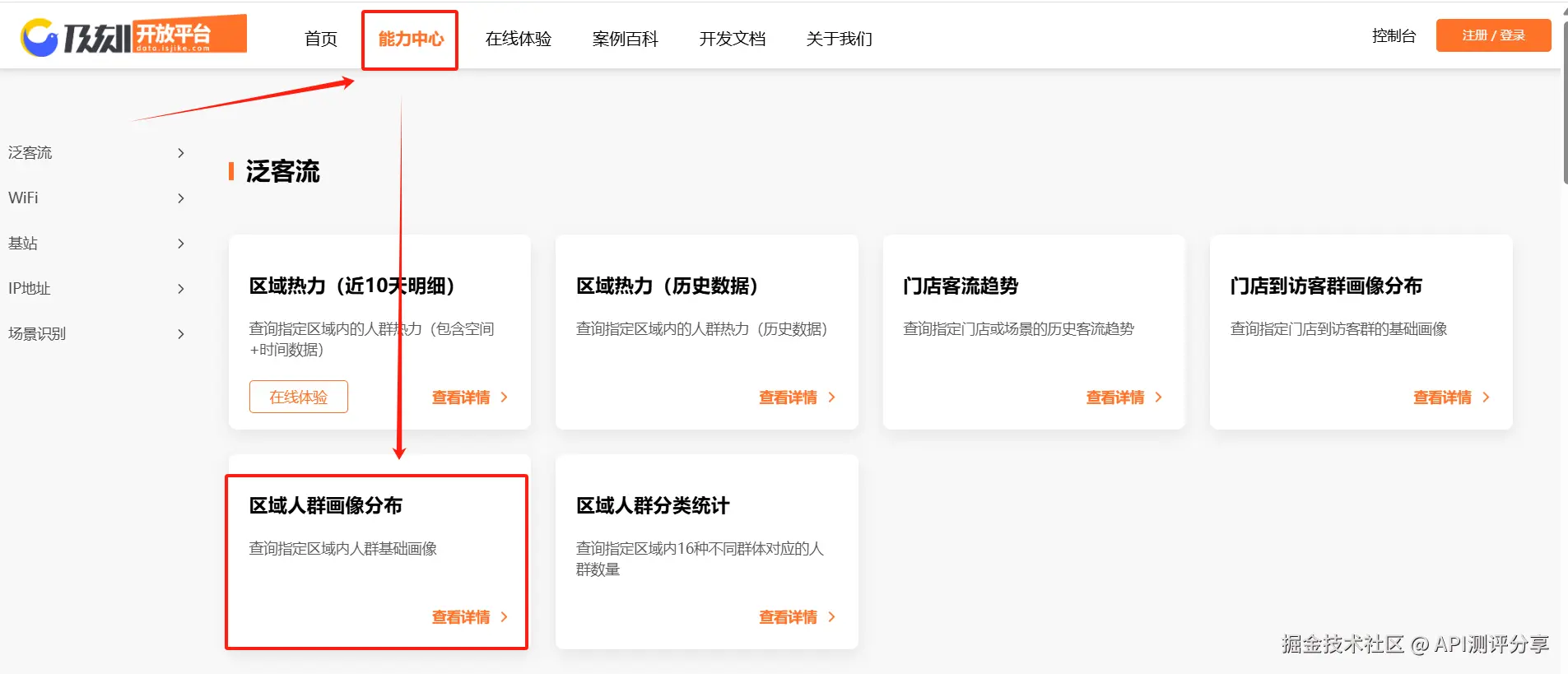 1、在开放平台能力中心页面找到“泛客流”栏目,找到区域人群画像分布API,点击查看详情;
