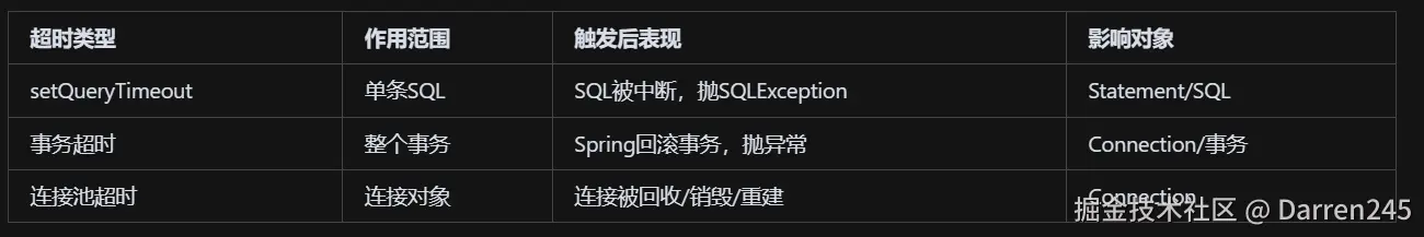 - 连接获取超时(如HikariCP的connectionTimeout):获取连接时的最大等待时间。