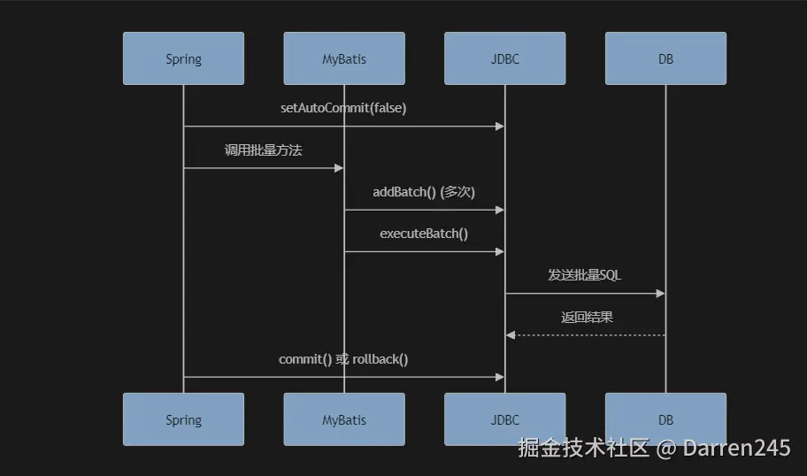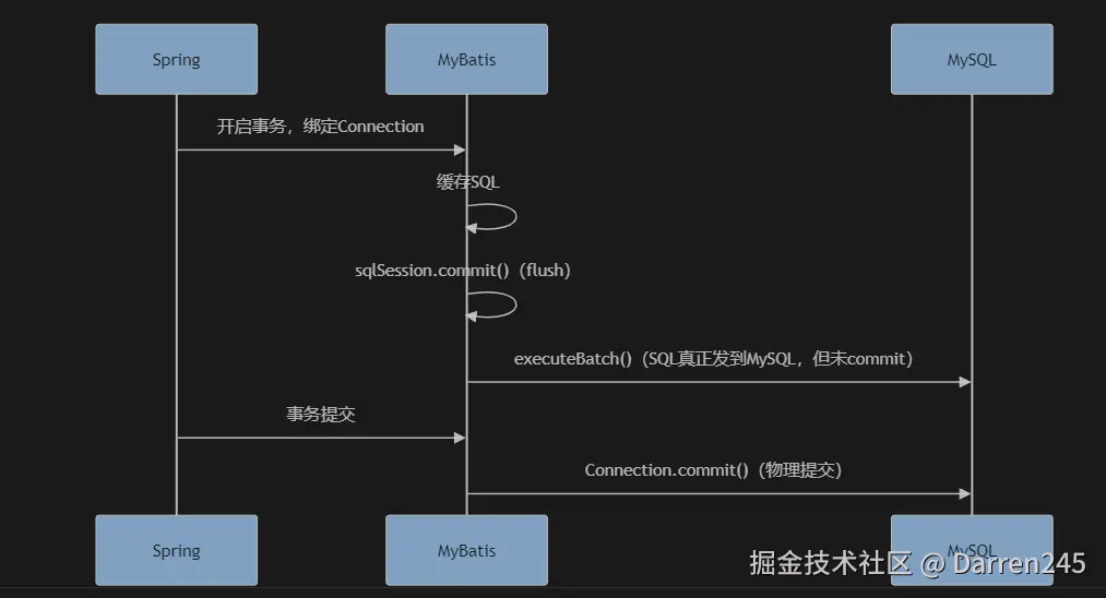 - sqlSession.commit():MyBatis flush批量SQL到数据库,但物理事务未提交。