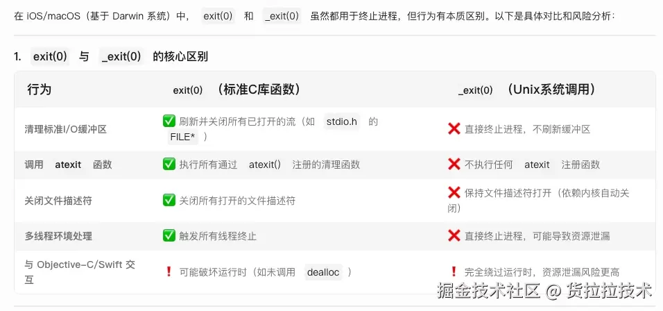 _exit(0)会绕过清理的流程直接终结应用程序,是有一定风险,比如说不刷新I/O缓冲区、不关闭文件描述符,但这些iOS操作系统都会帮我们进行善后处理,因此可以放心。