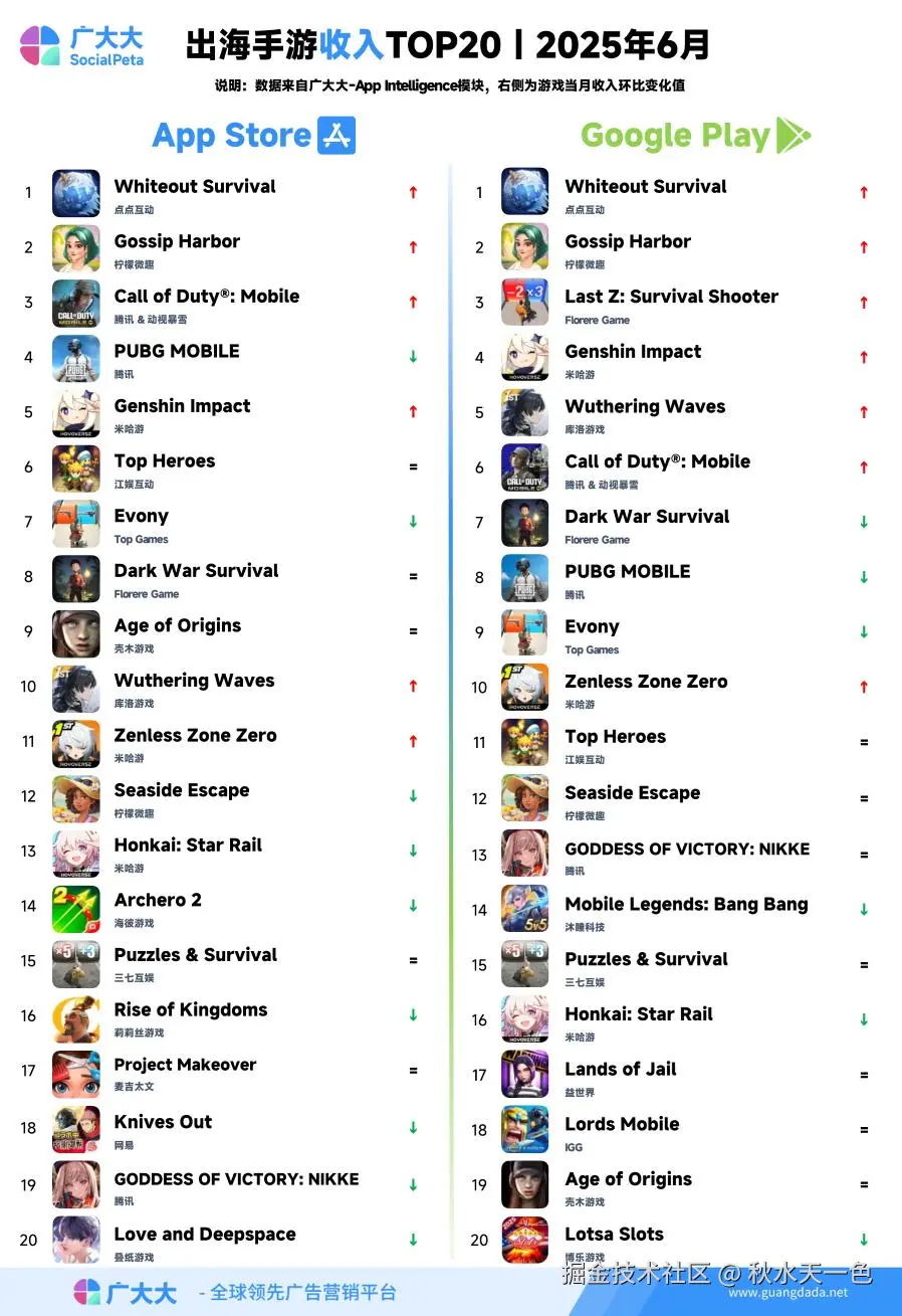 根据广大大——App Intelligence等模块数据,我们整理出2025年6月出海手游投放、收入和下载TOP20榜单,帮助更多出海手游从业人员了解全球移动市场变化趋势。